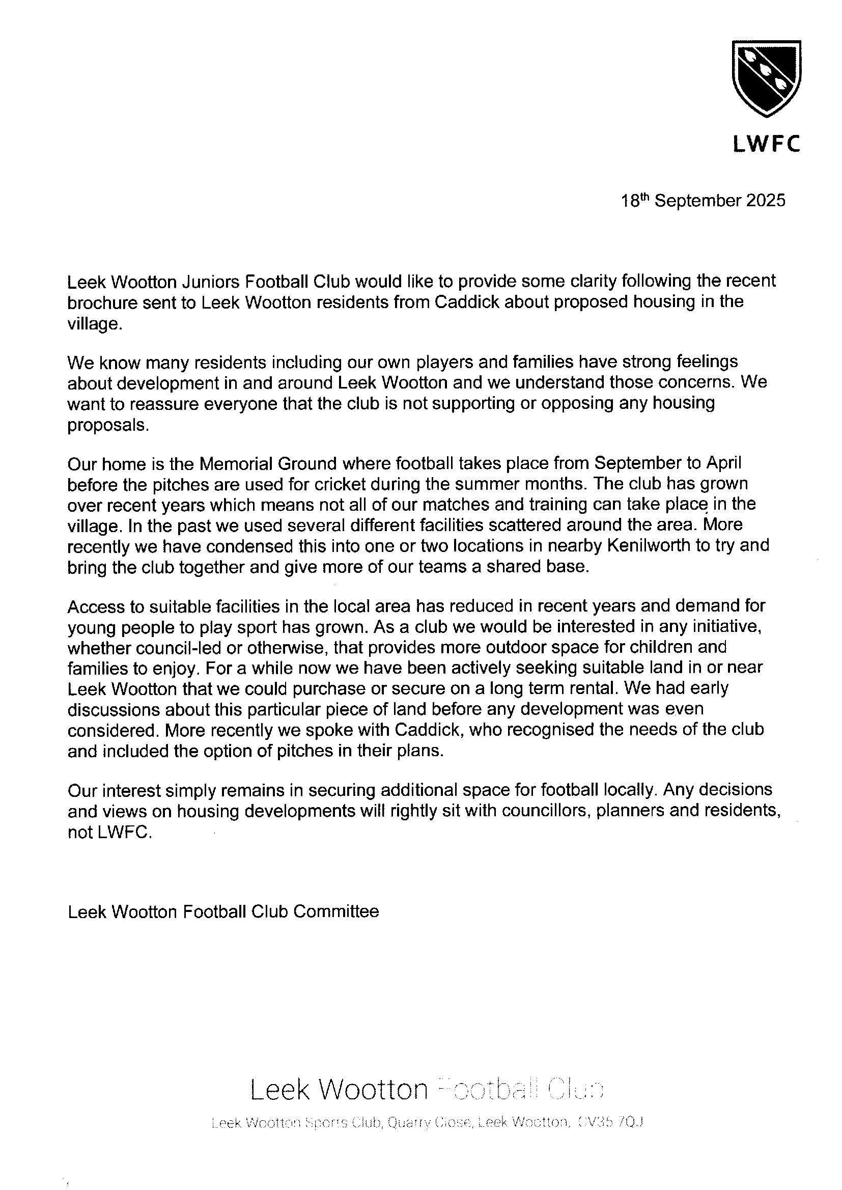 - 18 September 2025 – Letter distributed by hand from Leek Wootton Football Club